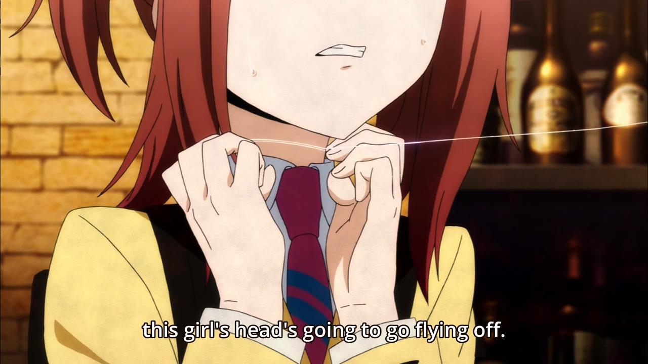What really bugs me is when people see an exception in their own personal lives and take it to be the rule. Oh, you found someone who is patient and strong enough to endure your mental problems? That’s great, but please don’t go around giving other people advice on what “true love” should be. Frankly, it’s dangerous. People always think love is supposed to be full of grand gestures, but that shit is unsustainable. Like how Linda’s reaction to her friends’ breakup is to tell Banri to chase after Koko. ‘Cause, y’know, that’s what the guy is supposed to do in romances! It’s a grand gesture! But fuck that. What happened to respecting the other person’s wishes. What happened to realizing that the other person has wants and desires too, and if they’re fed up with the relationship, we should respect their choice and give them the space they want?