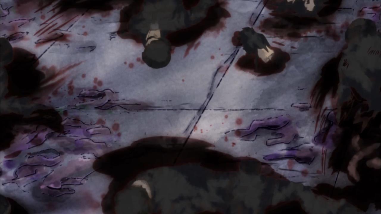 Oh, and by the way, those lifeless bodies ARE “censored.” See that black blurring around the figures, and the overall darkness of the image? That’s one of many methods used, a la Deadman Wonderland. Though it’s interesting how it’s MUCH easier to make out this particular scene’s composition and elements as opposed to the ones that simply show a knife and chainsaw being drawn / prepped.