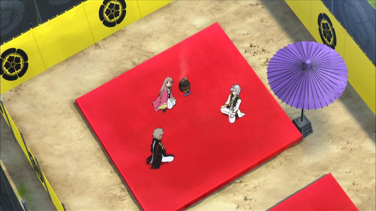 • Our characters then talk about the beauty of a tea party. Then they talk about what the cute bowl symbolizes. Then Nobunaga sits all informally because he’s a non-conformist. Then they talk about whether or not the West has tea parties. Yawn.