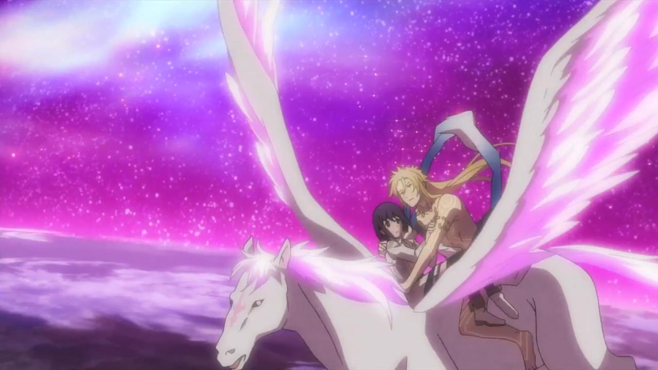 …on a glorious winged stallion (Pegasus, is that you?!). A winged stallion with pink feathers. That’s so fucking majestic. Too bad we don’t get to see how this scene plays out. We just get to see the two of them fly into a column of light, which then explodes into a ring of light, then finally, the title screen shows up.
