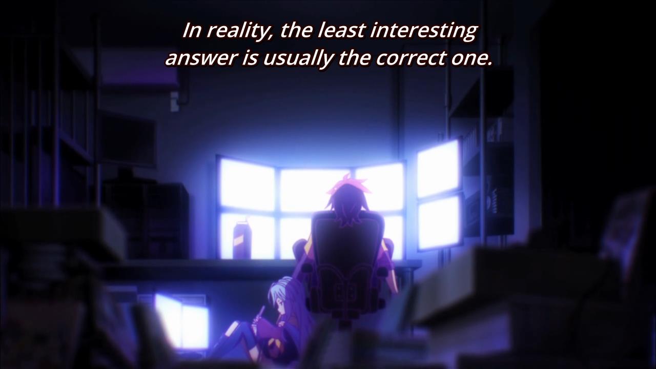 So for NEETs, especially Sora who apparently has problems with communication, life appears to have no meaning. It’s no wonder, therefore, that our two siblings choose to lose themselves in their video games where individual skill is perhaps the most important aspect of a player, and all the intangible bullshit do not matter. Still, there’s one significant problem.