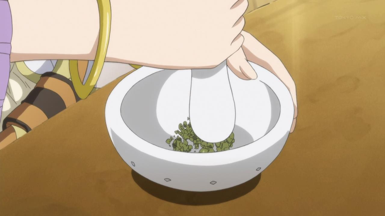 For a world with alchemy, this was pretty bland. So alright, Escha, the heroine of the show, wants to make something with the new cauldron. She mixes some liquids…