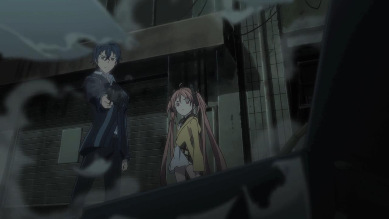 • So Enju and Rentaro are just hanging out in some shopping district when they come across a loli being chased by a pair of adults. The Cursed Children that aren’t lucky enough to be Initiators pretty much have to live in abject poverty, resorting to petty theft from time to time to survive. This would be really sad if the whole thing just didn’t feel so… hm, manipulative. Ah, woe be the downtrodden Cursed Children! Everyone hates them even though they’re humanity’s last hope against the Gastrea threat! That’s the thing with discrimination in these anime series. They’re always incredibly one-sided and devoid of nuance. Yes, discrimination has nuance, and you’re selling the issue short by painting such a serious matter in a one-dimensional way.