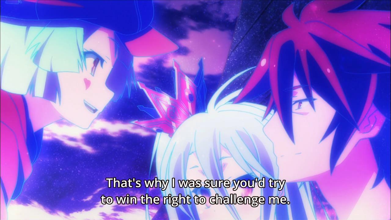 • Ah okay, according to Sora, the other races have imitated Imanity’s wisdom, and this explains why Imanity has fallen all the way to last place in Disboard. Having said that, Imanity need not fret! Why? Because the other races will never master wisdom. Again, why not? According to the guy, it’s because they lack Imanity’s humiliating cowardice, and, uh, this makes you wiser than you can ever imagine…? Right…