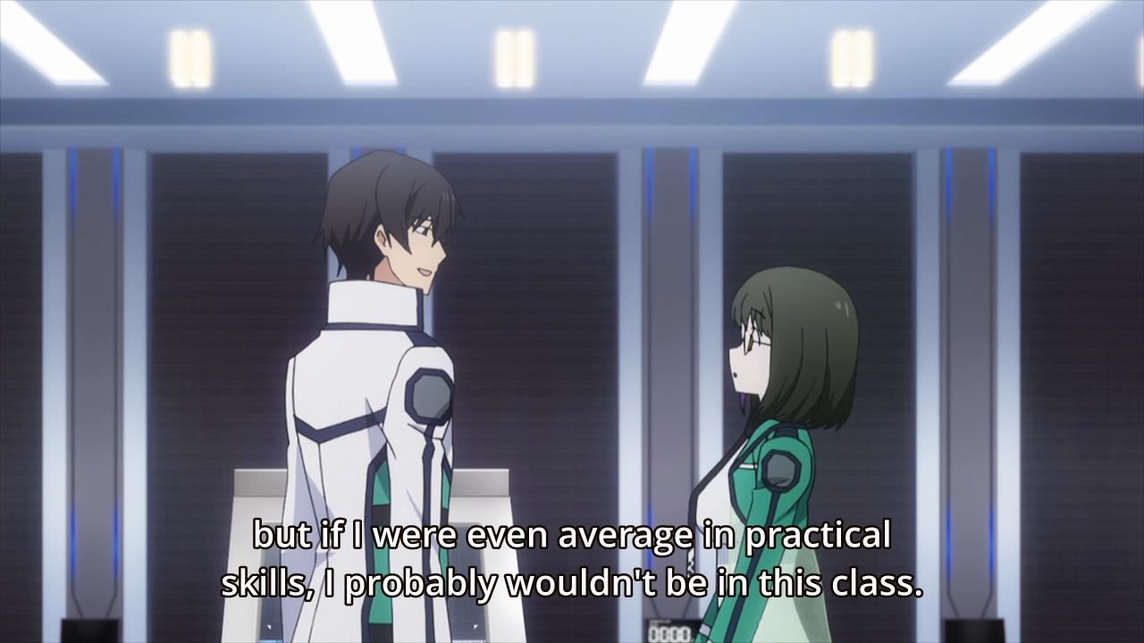 • In the cold opening, our Gary Stu finally clears some silly test after three whole tries. Three! Seeing as how I’m a bona fide Gary Stu myself, I really feel for our hero! Let’s be real though: this is the most half-assed weakness ever. A lot of Gary Stus are just brazenly perfect, and in this, there’s almost a level of honesty that you could respect. Almost. With Tatsuya, however, the anime insists that he’s absolutely terrible with practical skills, and yet, have you seen him struggle even once in this entire anime as a result of his oh-so-subpar aptitude? Oh no, he couldn’t easily pass a simple test. Woe be to him. But seriously, even though he’s a part of the goddamn Disciplinary Committee, his inability to use his spellpower “practically” has yet to hinder him one bit. In fact, what is not practical about using two waves to cancel out magic spells? But I digress, because the arbitrariness of this universe is a whole ‘nother can of worms.