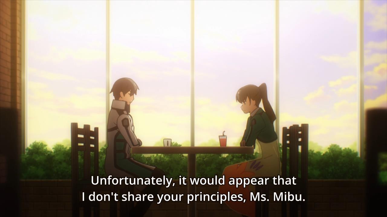 • Mayumi: “People’s hearts cannot be changed by force.” How do yo define ‘force?’ That’s the crux of the issue here. This anime seems to think of force in terms of terrorism-inspired actions, which, of course, is bullshit.