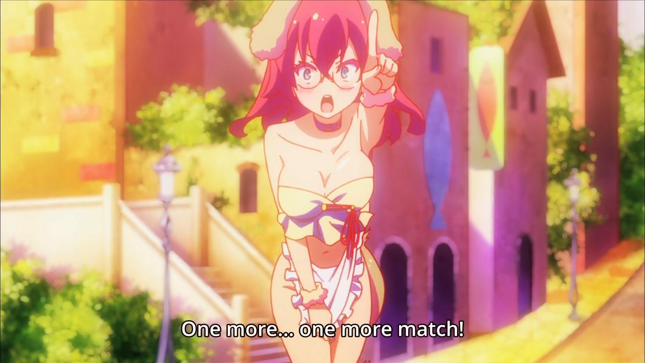 Anyway, since Sora so badly wants to conquer the Animal Kingdom for its bevy of, uh, doggirls, he’ll just have to win the library back. So that’s where we stand after the dust settles. But really, the episode is nowhere near as exciting as it sounds. In fact, most of the episode is padded by the wacky humiliation of Stephanie Dora. Like I’ve said, she thinks the siblings are being a bunch of bums. As a result, she keeps challenging them to a game. If she wins, Sora will have to become a “fulfilled” person. Sounds like the line could’ve been better translated, but whatever. If Stephanie loses the games, however, she gets humiliated. Naturally, she doesn’t win a single game. After all, the siblings never lose! First, they make her dress and act like a dog. Then, for every subsequent game that she loses, the siblings win a piece of her clothing. By the end of the episode, Stephanie is nearly naked.