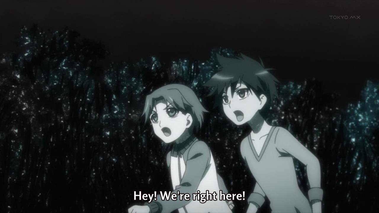 • Iwato and Raika find a crate of their luggage, but all of their stuff has been strewn about. Oh, that crazy Heito! Elsewhere, Emiru shows off her magical ability to sense that her teammates are… lost? Whatever. Minashi then whistles a song, which then gets the girl to sing that song we’ve heard before. Not only that, the song serves as a mating call for the entire team. Mysteriously, they just know exactly where to go in order to gather together. It’s the power of the song!