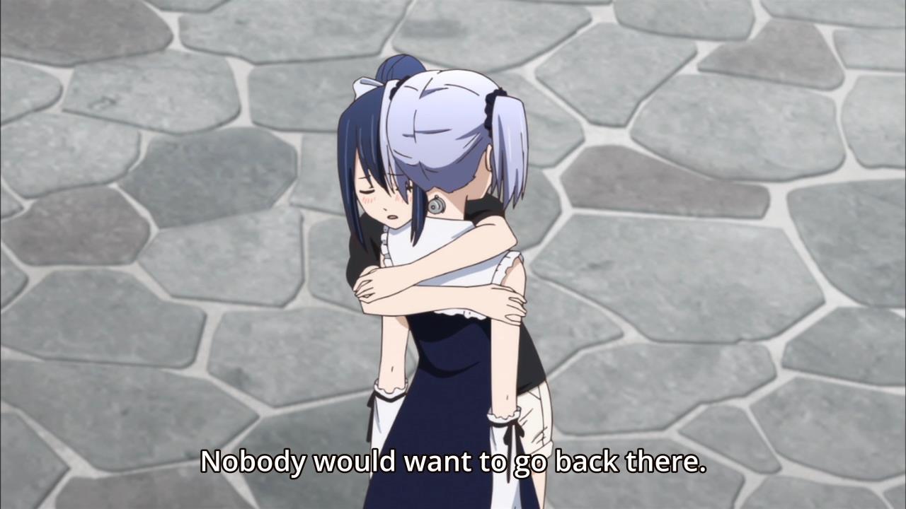 At one point in the episode, Nanami shows off her breasts for a whopping 1,000 yen. I had to sit there and listen as the guy compliments the witch on her beautiful gradation. Gradation of what, you ask? Oh, I’m sure you can use your imagination. Afterwards, she shows off her armpits for another 1,000 yen. The witch is certainly living the high life. Well, someone has to. I sure as hell am not. For an episode with this much exhibition — Ryota even walks in on his harem of witches bathing each other in the hot springs — it is also incredibly boring. It’s the same old story with every witch. Nanami has spent most of her life in captivity, so she is curious about the outside world. When she finally gets a taste of cheesecake — yes, cheesecake is the magical key — she no longer wants to return to the lab. Ryota and company thus try to recruit Nanami to their side, but the girl is distrustful. After all, she’s never had friends! Until, of course, she takes a glimpse into Ryota’s memories and realizes that Ryota’s harem totally wants to be befriend her. Wow, tomodachis? For me? Aw, you shouldn’t have! But yeah, it’s a pretty goddamn mundane story made even worse by the fact that we’ve seen this plot before in this very same anime.