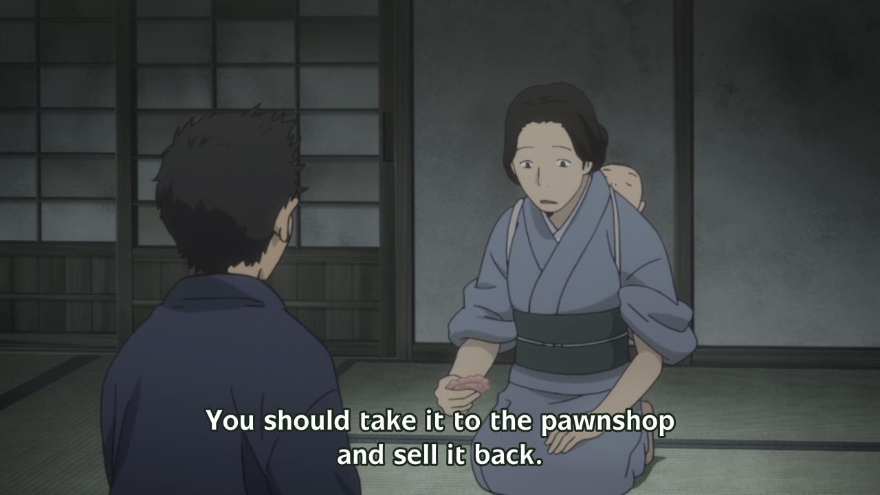 Ibuki’s mother heard that his ship had sunk, yet when she sees her own son, these are the first words to come out of her mouth: “You made it back alive.” Yes, she ended that sentence with a period. If you listen to her tone of voice, you’ll notice that she’s… eh, somewhat taken aback by her son’s sudden appearance? Even so, there’s no hint of happiness in her voice whatsoever. She doesn’t exclaim, “I’m so glad!” Nor does she say, “We feared the worst!” She simply states, “You made it back alive.” How utterly cold for a parent, much less a mother. Afterwards, she mourns the fact that Ibuki won’t be paid now that his ship had sunk: “My goodness. This is trouble. What am I going to feed the children?” I’m not vilifying the woman for wanting to feed her kids. And obviously, if Ibuki can help his family out, he should. Nevertheless, her kids are ultimately her responsibility, aren’t they? He didn’t bring them into the world, did he? That sounds cold, yes, but she’s making it sound as though it is Ibuki’s fault the kids won’t get to eat. She’s the parent, so it’s her job to raise her own children. But that’s the independent streak in me speaking.
