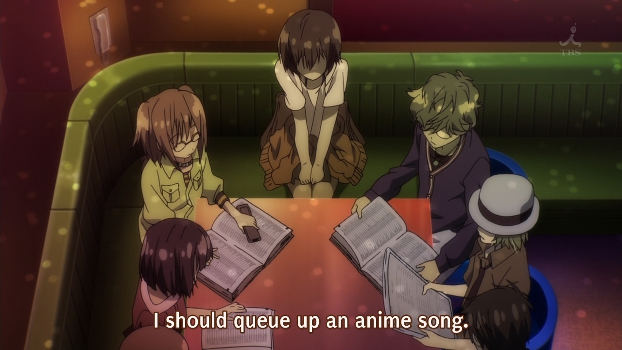 The first half of the episode focuses a bit on Sayaka’s backstory. She’s a mean ol’ number, however, so I don’t really care to learn about Sayaka. In the second half of the episode, Kazunari once again assumes the invisible hand that guides Ritsu through her life. In doing so, he helps the girl acquire her very first high school friendship. Wowza! Not only that, he helps her cross the streets so she can stay perfectly enamored in her novels as she walks home from school. Gosh, how did she ever manage to live without him? Oh yeah, she did. Nevertheless, isn’t Kazunari such a nice guy? Naive and hopeless romantics will watch this sort of show and think that they should emulate the main character’s behavior. After all, isn’t helping the girl when she doesn’t even realize she’s being helped just the most romantic thing ever? The problem here is when, y’know, reality doesn’t quite resemble our fantasies, and the girl doesn’t automatically fall in love with you just because you did her a few friendly favors. Then people get all mad and curse the opposite sex for not dating the “nice guys” that are right in front of them. I totally feel your pain, bros.