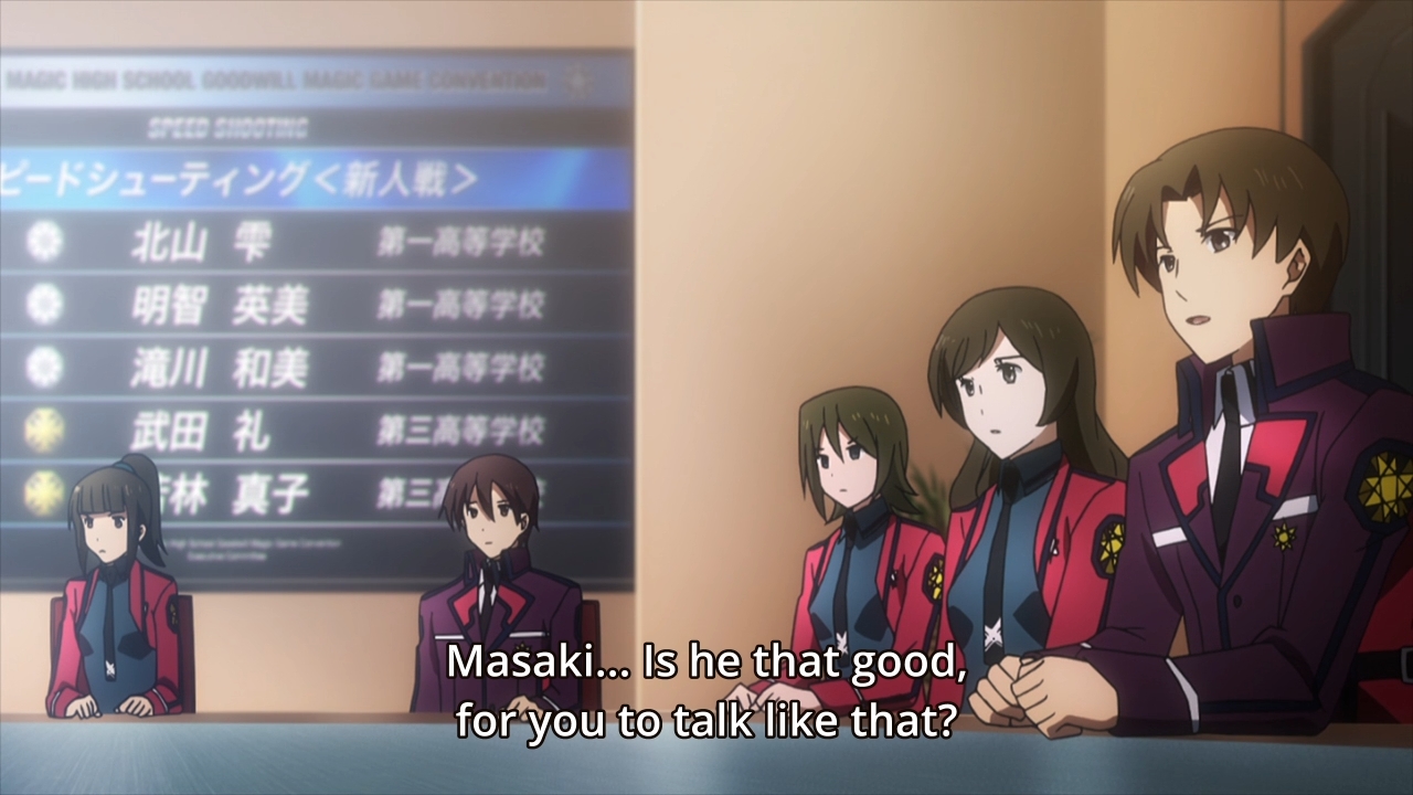 — They’re now talking about the rifle Shizuku had used and how it was “cutting-edge technology.” There’s actually a big debate in the real world about whether or not technology might adversely affect the integrity of sporting events. Still, an athlete’s personal skill level determines much of his or her performance, and technology can only give you a small edge. The debate is whether or not that small edge is substantial enough to raise any real concerns. That’s the real world, though. You get the feeling here, however, that the devices are everything. Yeah, yeah, they think Shizuku is decent with magic, but at best, it’s a passing remark. They completely trash the other two girls. On the other hand, the characters are gushing on and on and on about the rifle just like how Mahouka typically gushes on and on and on about magic. Just the fact that technology accounts for even 50% of an athlete’s performance is ludicrous, but who’s to say Tatsuya’s engineering genius isn’t accounting for even more? “B-but it’s a futuristic world, so technology should matter!” Sure! Then make it a competition between competing technologies and their engineers then. Don’t call it a fucking sporting competition, and have the entire thing come down to Tatsuya’s Gary Stu brilliance.