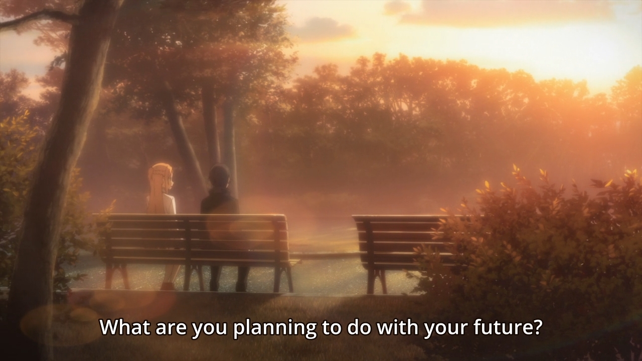 >So what do you want to do, Asuna? Kirito just talked about his future aspirations. What are >yours? Asuna says, “I want to stay with you forever, Kirito-kun.” Right, you just keep dreaming >big, Asuna. Girls don’t need to have career. She adds, “It’d be great if Yui-chan could be with >us here, too…” Oh, our virtual loli daughter. How could I forget.