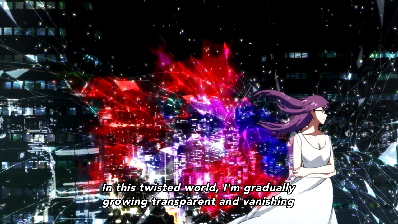 — And later in the OP, we see the motif of the broken mirror, and this is probably a sign of when the characters go one way or the other. Most notably, the image “cracks” whenever we see Rize; the OP features this twice. She does, after all, want to wholly corrupt our hero. When Ken is suffering from symptoms of withdrawals, and we can see a reflection of him shaking uncontrollably on the switched-off TV, Rize moves in front of the mirror surface as if to body block the portal between the two worlds herself. Not surprisingly, she doesn’t put any importance in our hero’s existence as both human and ghoul. She wants him to be whatever she wants him to be. When Ken later gives in to Rize’s temptations, there are no reflections of him in the car window that he is pressed up against: