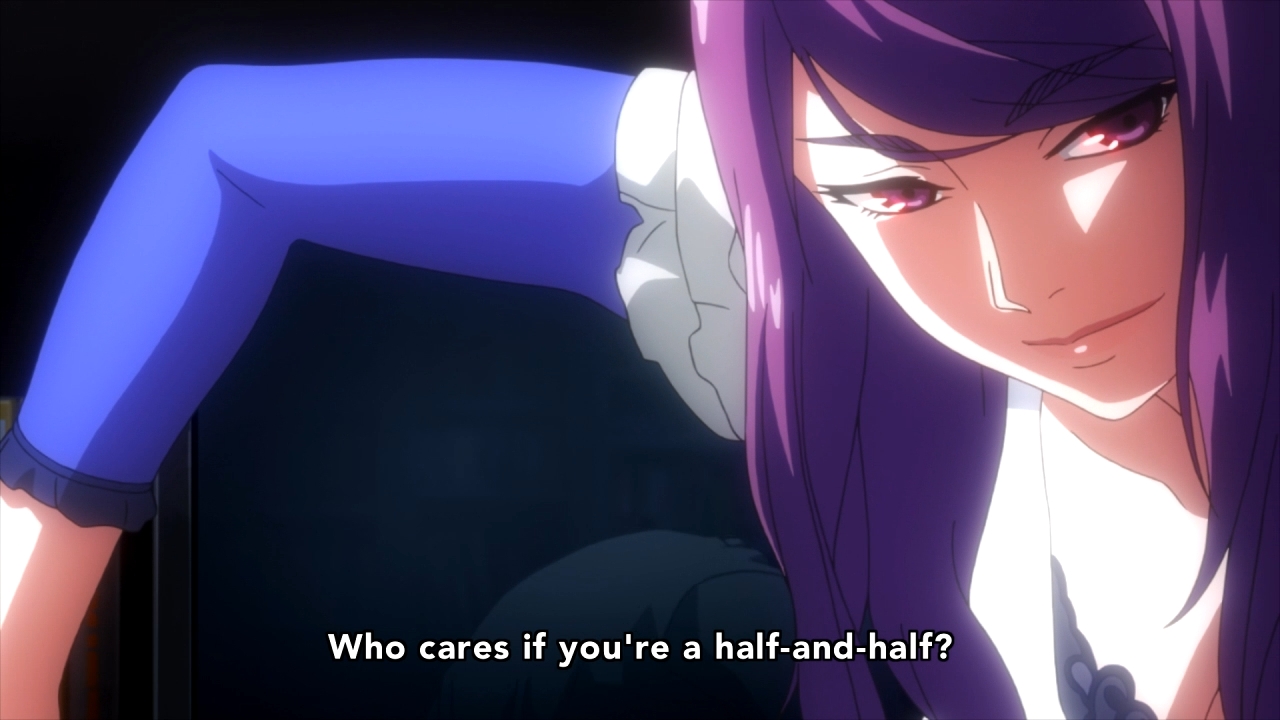 Our hero has one foot in each world: he’s both a human and a ghoul. He has the base desires of a ghoul, but the moral framework of a human. But there’s more to it than that. Nishiki repeatedly makes note of Ken’s femininity. First, he accuses the protagonist of stinking like a female ghoul. Second, when Ken charges at Nishiki, the latter taunts, “Seriously? Attacking with your bag? What are you, a woman?!” Ken is a guy on the surface, but there are nevertheless female organs within him. In this sense, he’s half-man and half-woman. Still, we can take this duality even further. When Ken finally snaps, he attacks Nishiki much in the same way that Rize would. At least in this very episode, Ken’s powers are Rize’s powers. As a result, he’s half-Ken and half-Rize.