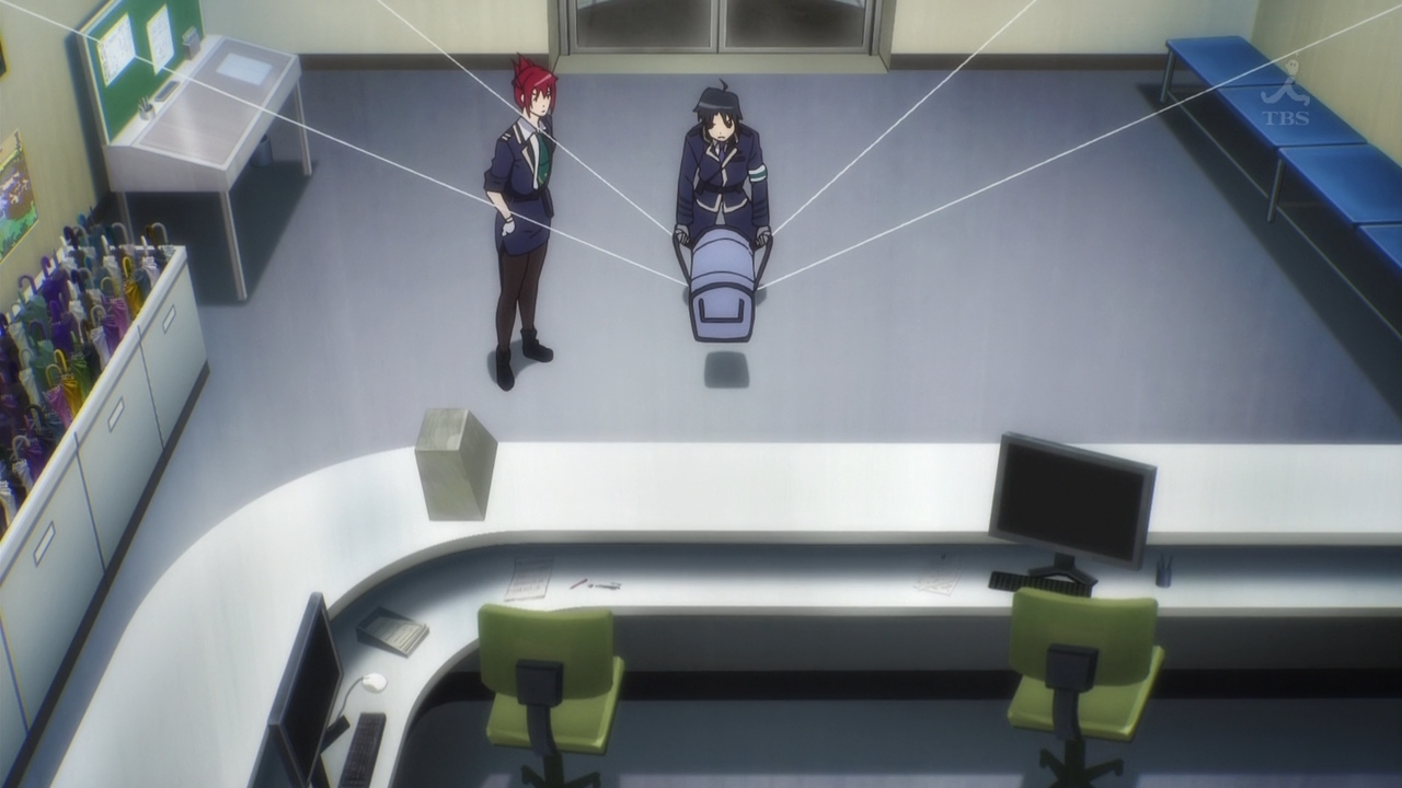 …sit the bomb precariously atop two thin pieces of strings that we’ve hung from the ceiling… um…. what if the dog gets overexcited and jostles the carrier? What if either of those strings snaps? Aoi then crawls beneath the bomb and slices the bottom open with a box cutter. Oh c’mon. I thought she just said that the bomb could be rigged with traps. How the hell does she know she won’t be triggering any of those traps by cutting into the carrier? That’s not even the biggest problem, though. After all, how the hell is she even remotely qualified to do this? Did they train these kids how to defuse bombs at the academy as well? Not only can they handle firearms, they can be on the bomb squad as well?