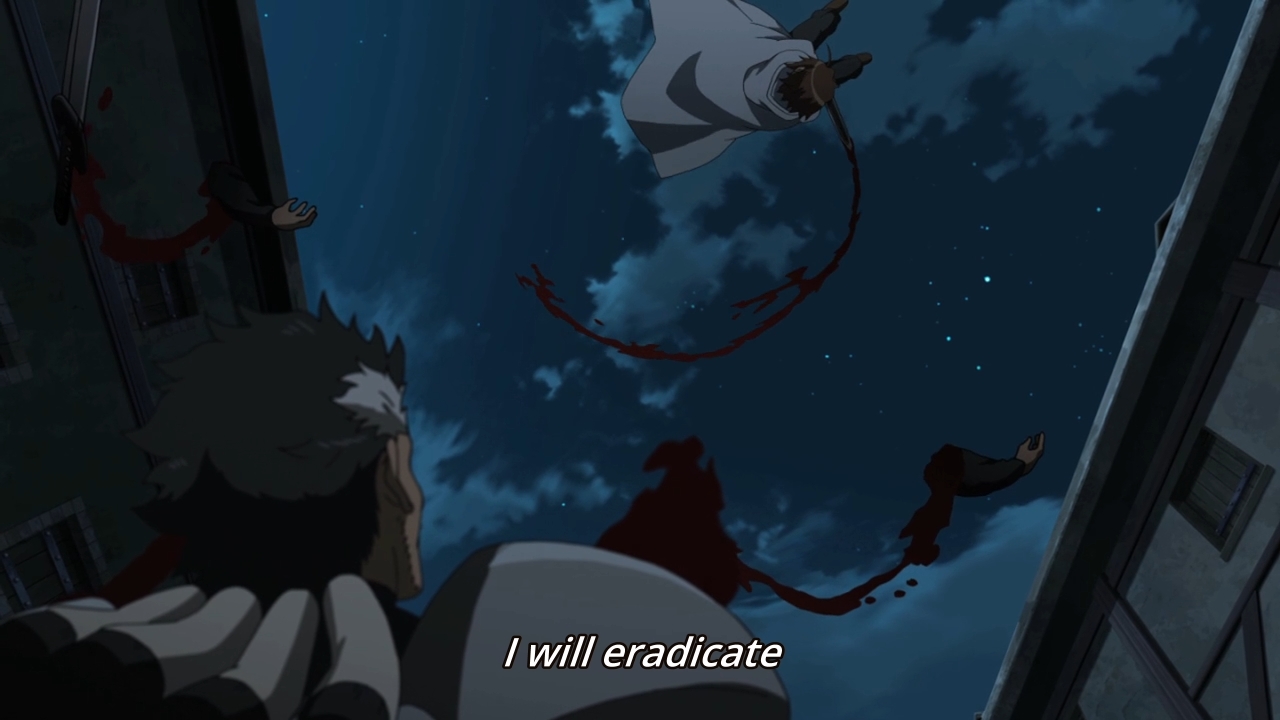 — So the fight between our hero and his target is underway, but they fucking talk too much. The Ogre is just going on and on about how he’s going to target Tatsumi’s client. And sure enough, all that talking enrages our hero. As a result, Tatsumi hacks the Ogre’s arms off, then twirls in midair in slow motion as he pontificates on the nature of these evil, evil people. It’s so fucking ridiculous. But hey, hacked limbs and gallons of blood everywhere!