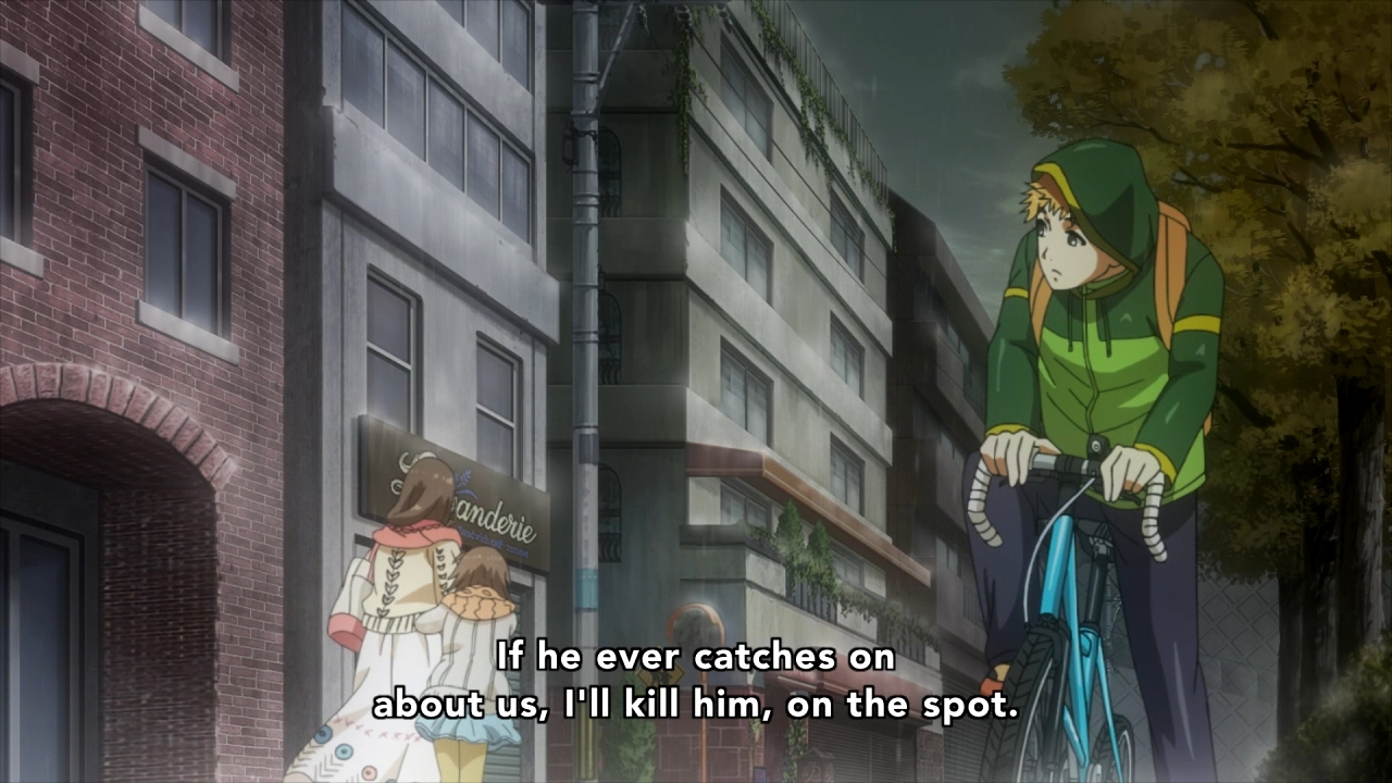 — Ken can’t help but wonder why Touka would want to be involved with humans so badly. Uta can’t answer his question, but from personal experience, he finds it enjoyable whenever he does get to deal with a human customer. I wonder if this excitement is just this need to feel wanted and accepted. Even if humans ultimately do not realize who or what they are accepting, it must nevertheless feel nice for Toufa to feel as though she belongs somewhere. After all, the ghouls are keenly portrayed as the Other, and this is not reflected in just the fact that they are literally ghouls. When Touka takes Ken to see Uta, they plunge themselves into Tokyo’s seedy underbelly. They enter parts of the big city that the big city itself would like to turn a blind eye to. This is a place where women sell their bodies, where families are broken and full of strife, where alleyways are homes to potential drug deals. Naturally, the ghouls have had to hide themselves on the fringes of society even though it is hardly safer for them to do so.
