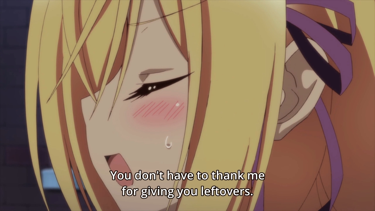 Yo, that’s not even where the pussy goes. Alright, that’s enough of the OP for me. Time to skip ahead and watch the anime itself. As you’ll recall, Kamito is here to participate in the prestigious Blade Dance event. Why is it so important? Oh, if you win, your country will prosper for years and years to come. No pressure, though. Not only that, the winner will have one of her wishes granted. Let’s hope nobody here wants to bang her twin brother. In any case, Kamito won’t be fighting for any sovereignty. Rather, he’s in it for a hot anime babe. This is a harem anime, after all. Having said that, we can put the Blade Dance tournament aside for now, because the main character will most certainly have to power himself up over the course of the season. For now, the biggest concern is… his stomach. Can a man get something to eat around here or what?