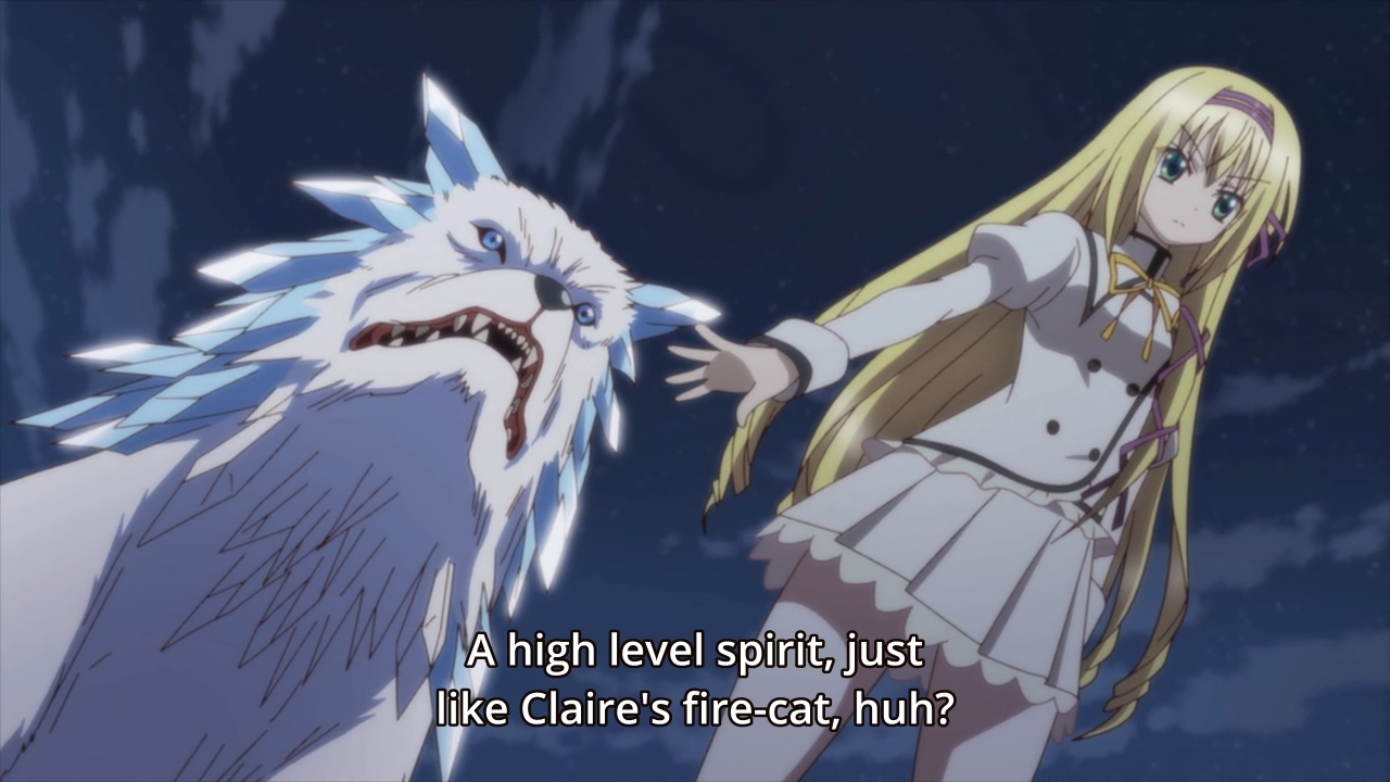 Rinslet runs into trouble, however, because Claire was also on her way to bring the harem lead a bunch of foodstuff. Why? He’s her contracted spirit, after all! Even though, y’know, he’s not a spirit. But ah well, when have haremettes ever been logical? Anyway, the two girls are about the fight over a guy. As a result, they each pull out their respective Pokemons. First up, we have Rinslet’s dire wolf: