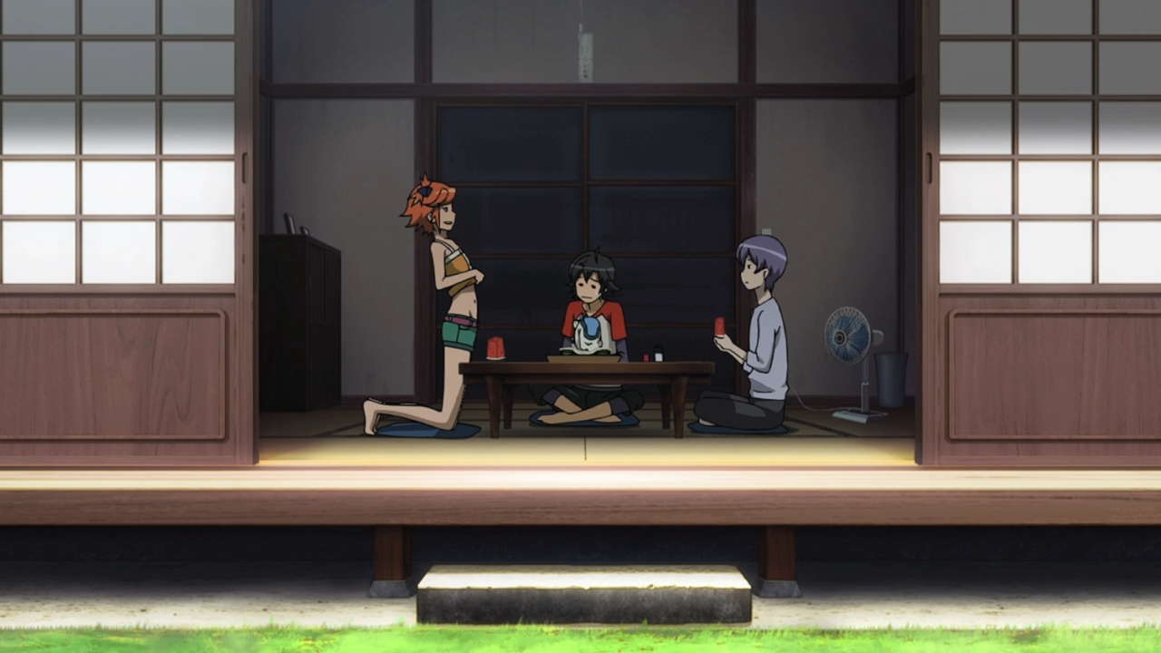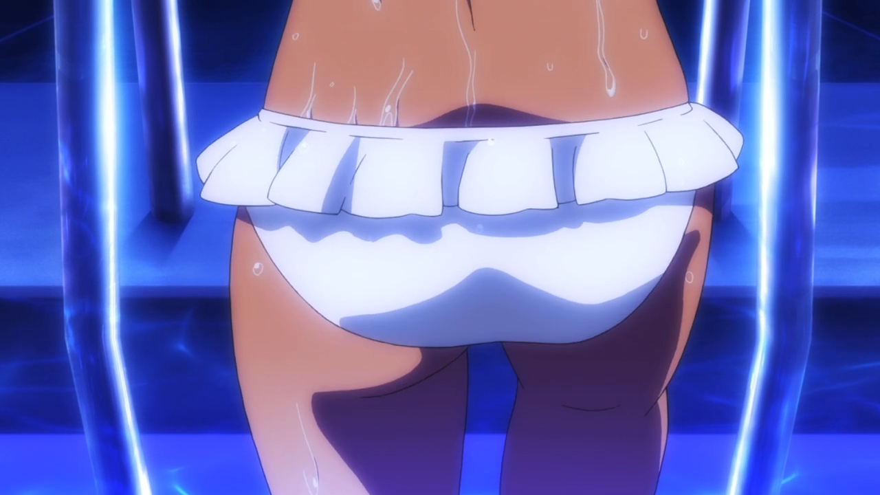 Proper world-building? Nah. Constant fanservice? Sure! When Hana finally takes her seat with the other two “sunbathing” girls — employees of the Tenkaidou — guess what the three them proceed to talk about. Guess! Guess! That’s right! They talk about who Hana likes! You know, the female characters on this show constantly take breaks from the action to relax and enjoy themselves, so you’d think they have the time to talk all about all sorts of interesting topics. But no, even on their vacation, they talk about boys. Fucking lame. Basically, strip these girls half-naked, then have them giggle over boys for an entire scene.