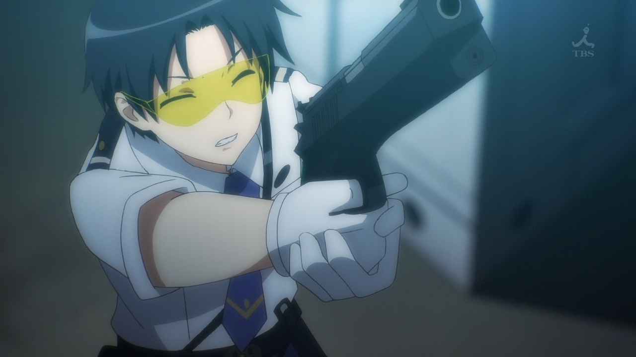 — Aoi shows Naoto no mercy whatsoever, because according to her, mercy is wasted on criminals. I guess “innocent until proven guilty” doesn’t mean much in her book. Plus, this duel between her and Naoto isn’t really fair. She accuses him of looking up her skirt, but then again, she has the upper ground and, well, she’s wearing a skirt. What is he supposed to do? Oh right, just shoot with your eyes closed. That’s a good habit to learn. Let’s see how that works out for him:
