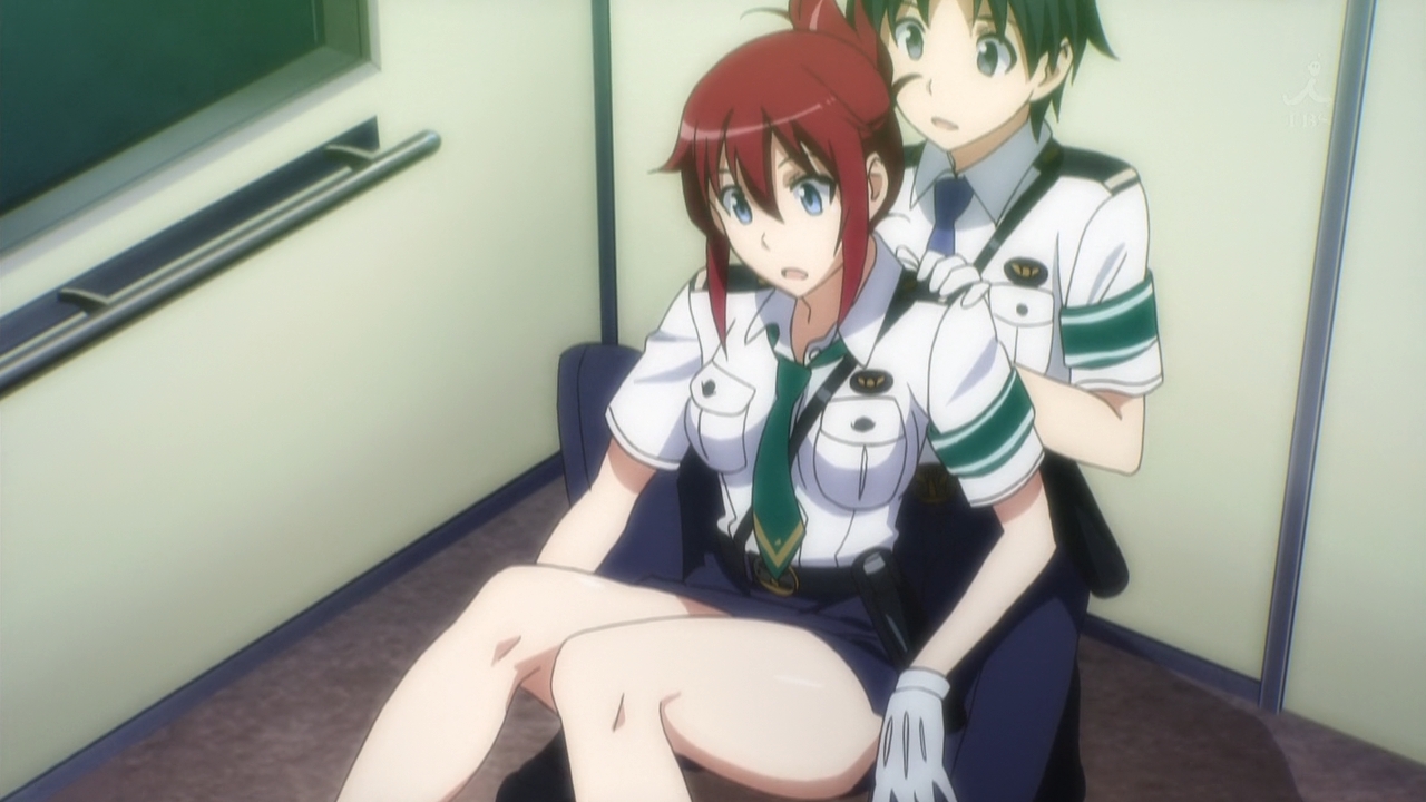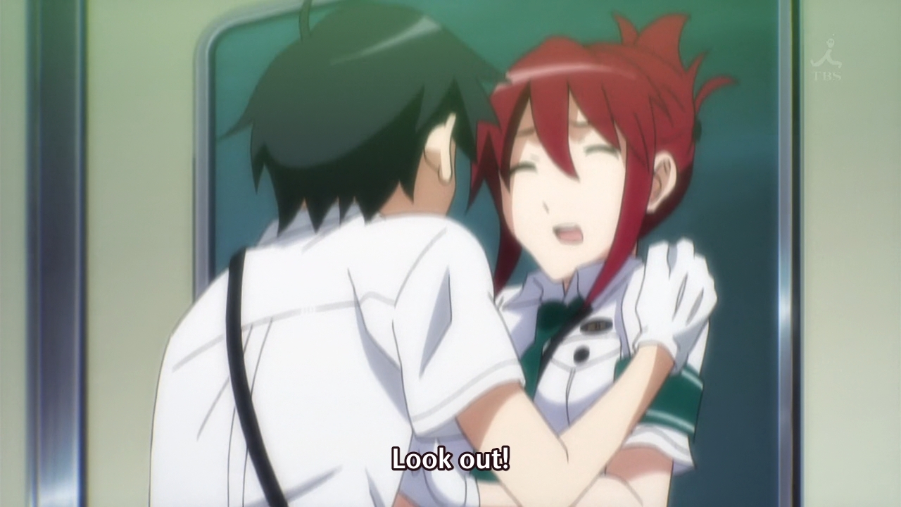 — So what’s the story this week? Well, remember the bomber back in week two? He apparently has an accomplice. But even though it isn’t Aoi’s job to arrest this new suspect, she chases after the him anyway. In doing so, she drags Naoto along with her. As a result, they have all sorts of wonderful adventures. Like falling on each other when the train stops abruptly: