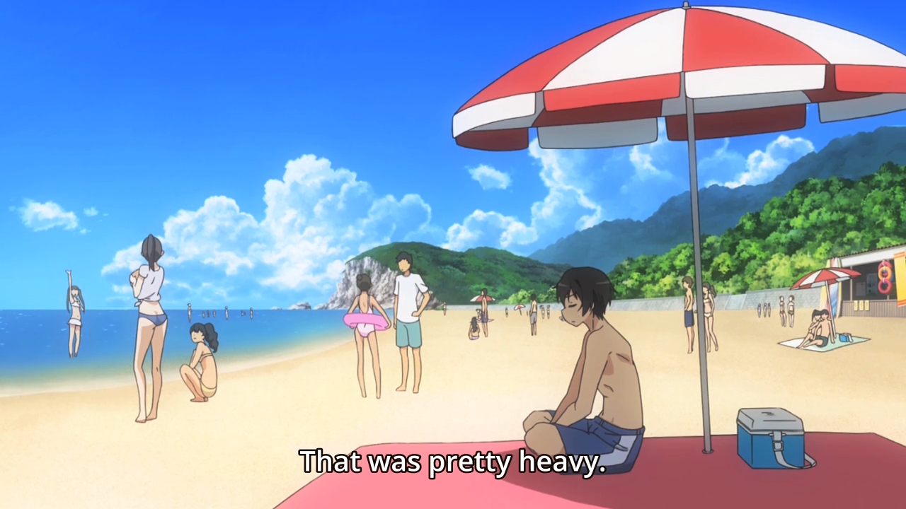 09:41 — The girls are finally in their bathing suits, and naturally, they draw the crowd. The harem lead’s girls are always the hottest girls around. No exception. Normally, girls would want to check guys out as much as guys check them out. But not in an anime. In anime, the girls are totally oblivious to any other guy but the harem lead: