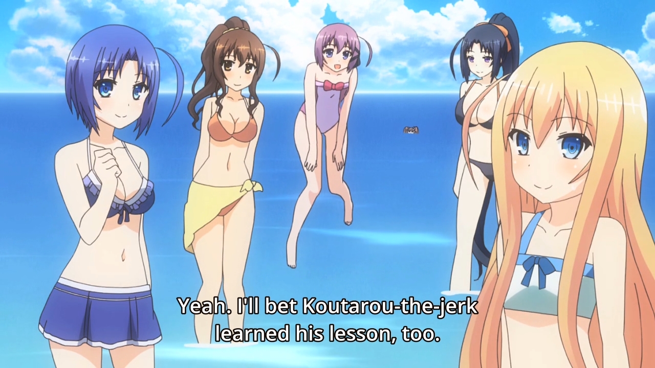 10:23 — Alas, despite the haremettes’ various cute and/or sexy bathing suits, Harumi-chan with her white summer dress and parasol combo takes the lead anyway. And of course she does. She’s your typical, boring, understated Japanese beauty. A girl like Kiriha might have giant breasts, which harem fans are content to masturbate to, but let’s not kid ourselves. Simply because she dares to wear a two-piece bathing suit, she is automatically considered inferior to someone like Harumi. A true Japanese waifu would never show off her goods like that in public for other men to see!