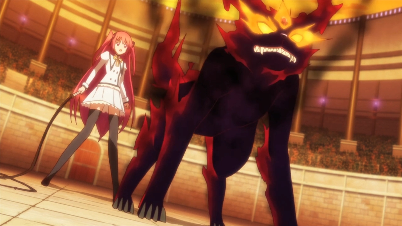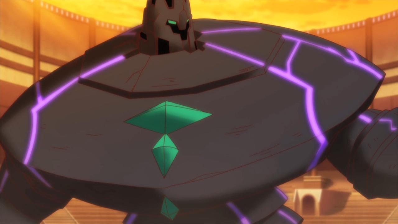 — I’m not going to describe the fight between Kamito and the giant-ass golem. It’s just poorly animated and ugly. I mean, look at this. It’s horrendous. And that thing attached to the golem’s left wrist? Yeah, it’s Claire’s whip. Somehow, it grew in length and size. Not only that, it’s strong enough to hold back a giant-ass golem. B-b-but it’s not like she wants to save Kamito or anything!
