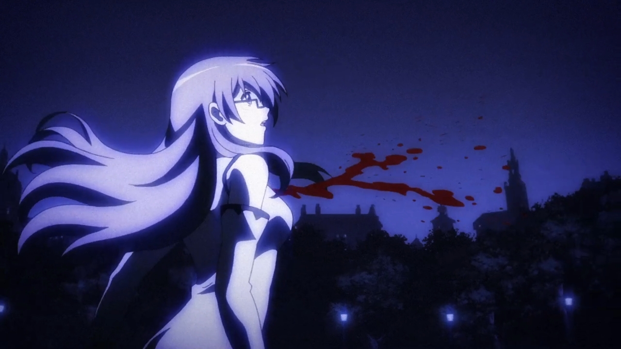 — The anime immediately cuts to Mine and Sheele attempting to make their getaway after a job well done (supposedly). Unfortunately, Seryu, the crazy dog lady we had just met last week, is lurking in the shadows. Alright, you just know someone’s going to die. Seryu looked so harmless in the previous episode, right? This just means she’s extra dangerous, because that’s ironic and unexpected! And the viewers will be caught totally by surprise when Seryu kills one of these two girls, or maybe even both! Well, probably not both. That’s just a waste of suffering that we can exploit later!