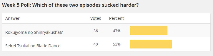 Aw, so close. The contest is now 4-1 in Seirei Tsukai no Blade Dance‘s favor.