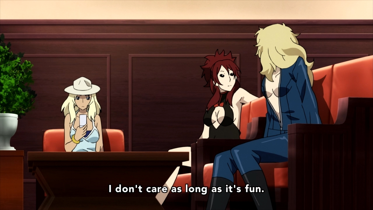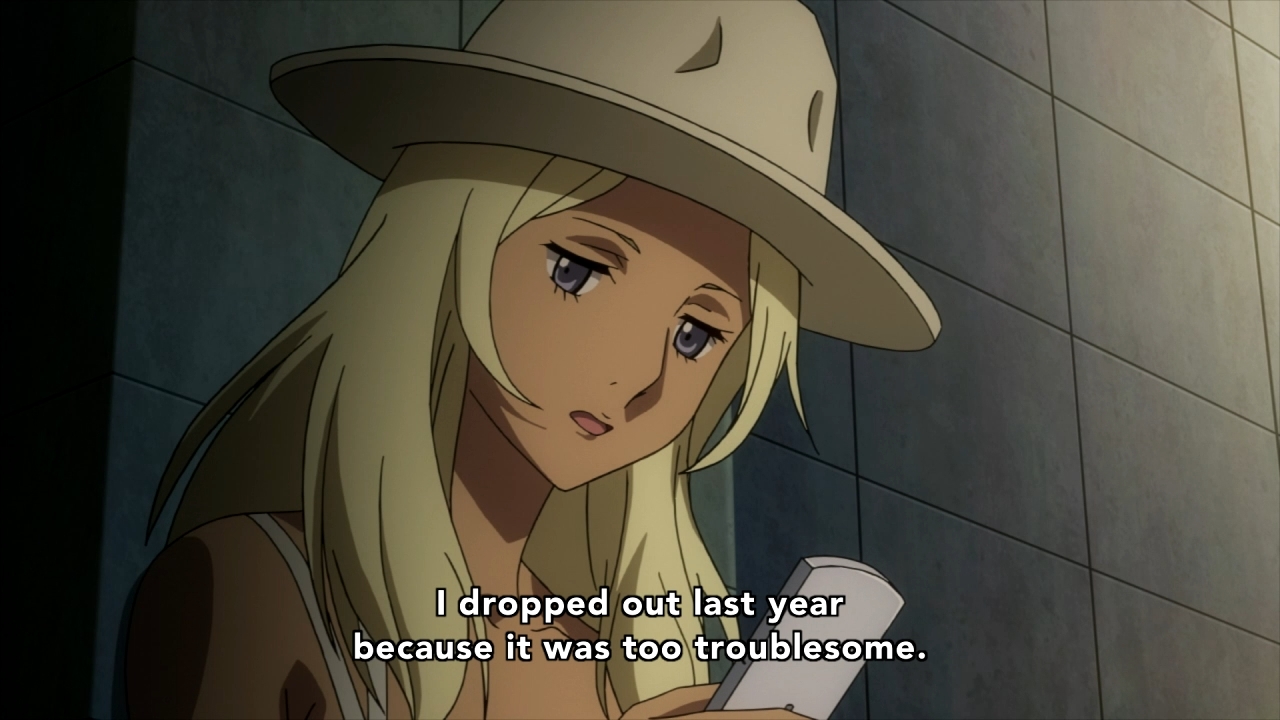 — The next day, Rinka is on her way to school. I guess even if the world’s at stake, an anime character can never neglect her studies. It’s just silly.  Seeing the heroine suddenly decide to take a break in the middle of her training to attend class just doesn’t make any sense. There’s a terrorist organization out there hellbent on enslaving humanity, and not only that, her main squeeze is still, in her mind, a prisoner. Nevertheless, the main character’s got to go and study hard. Why not just make the main characters adults and never have to worry about this nonsense?