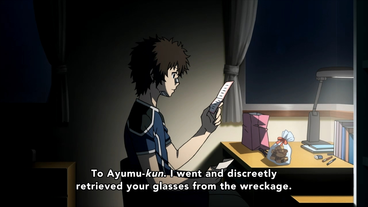 — A random scene where we check up on Ayumu, since we haven’t dealt with him since the start of the episode. It’s kind of like, “Oh, by the way, this is what’s going on with the kid…” Yeah, Murasaki made him cookies, so I guess we’re going to pair everyone up or something.