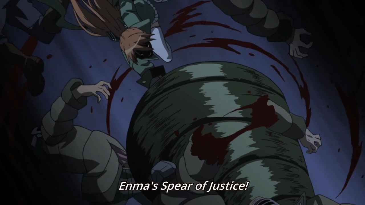 — So Seryu’s gain a gigantic drill for a weapon. Something something pierce the heavens. She has other weapons but they’re too boring to even mention. And yeah, the Jaegers are just slaughtering scores upon scores of faceless bandits. There’s no real point to this scene other than to see the bad guys rip people to shreds. Not only is this scene pathetic in its cruelty, it’s also boring. ‘Cause, y’see, being over-the-top means you literally go over the top to the point of ludicrousness. Akame ga Kill! isn’t really offering up anything new, though. I’ve seen bloodier and more gruesome action elsewhere, so it isn’t over-the-top. It’s just a cringeworthy pretender. That’s why it has to rely on gimmicks like mass rape for shock value. The action just doesn’t hold up. And if anyone ever complains, “That’s just war for you!”