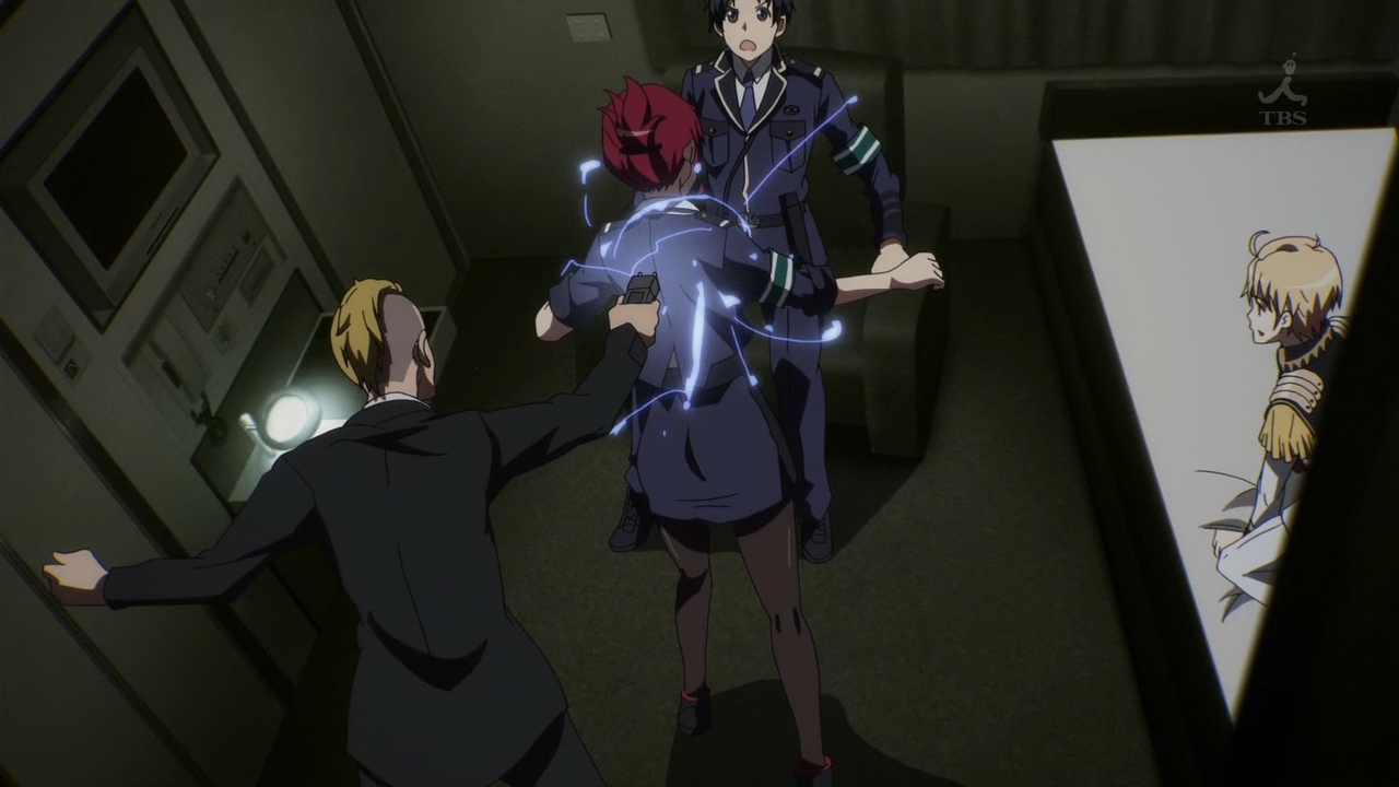 — But not if Aoi has something to say about it! So at the start of the scene, she had been swiftly kicked away by the bad guy. And now we see this. All I can think is that the girl picked herself back up, ran as fast as she could into the room, then instead of tackling the mohawk guy out of the way — y’know, the sensible thing to do? — she opts instead to jump in between the stun gun and Naoto. Uguu, have my ahegao instead~