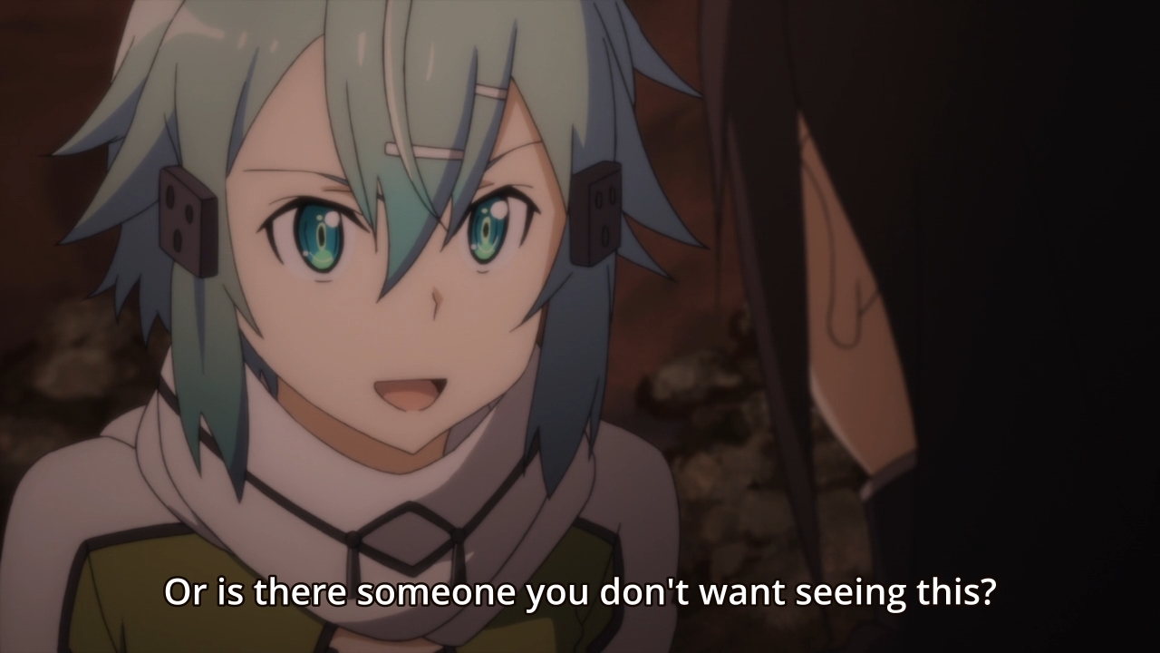 — Sinon’s only purpose in this entire scene is to offer up weak ass refutations to Kirito’s theories that the Gary Stu can easily shoot down.