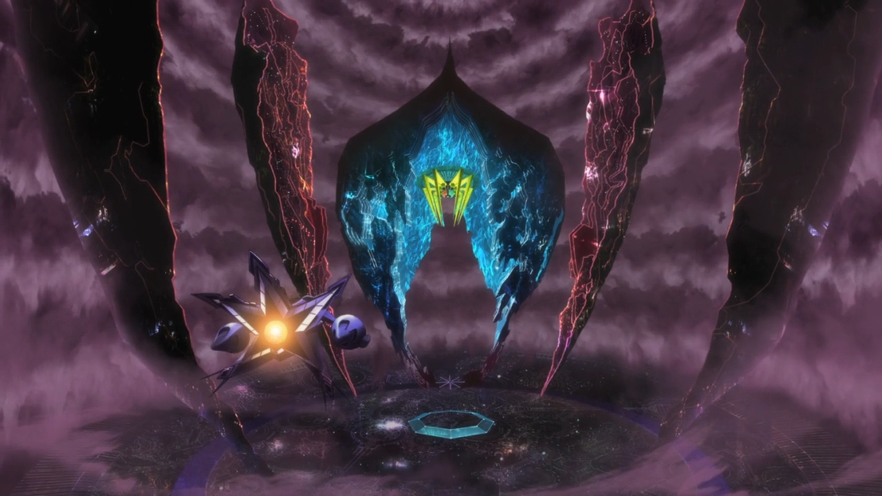 — All of a sudden, Puck shows up! And he attacks Setsuna, because she’s somehow a threat to the AI. What’s going on, guys? What is the AI even doing here? Hell, do the good guys even know Puck exists? I’m not sure if Daichi and crew have ever even interacted with Puck once in the entire series. Is this where the Kiltgang realizes that Puck is the true villain of the series, and they must reluctantly join the good guys in order to take down the rogue AI once and for all? Puck now has the ability to install his ego into every sentient life form in the galaxy, so I guess he’s god. And since this is anime, god is always the biggest threat. This is a bit of a lame turn in events. I mean, the true villain is just a powertripping AI. Two lifeforms went at it, but in the end, it’s technology that we must be wary of. And again, the good guys don’t even know who or what Puck is. It’s just lame. Daichi tries to take Puck out in one shot, but oh no, you haven’t seen my final form yet! When the smoke clears, Puck reveals his next iteration!