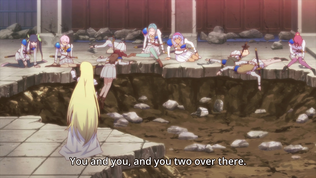 — We have good animation as always. And naturally, Oldenfart’s first act is to destroy school property all just to see if any of Fahrenfart’s “pawns” are strong. But it’s okay. In bullshit anime like this one, any damage to buildings will magically repair itself by the next episode.