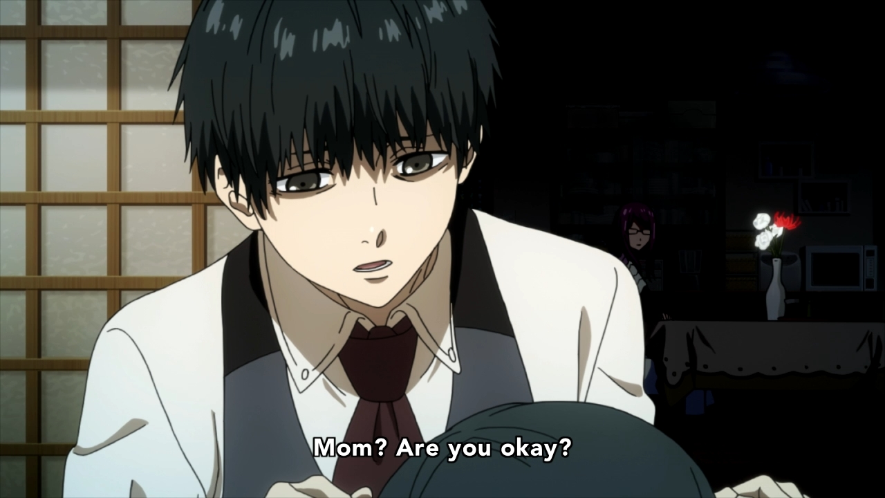 Sitting amidst a field of white flowers — white being the color of innocence and purity — a shuddering, sobbing Ken feels a feminine hand reach out and caress him. He instinctively calls out for his mother, but when his blindfold falls off, he realizes that it is none other than Rize standing before him. Wherever Rize stands, the white flowers beneath her feet turn to red — red being the color for anger and hatred, but also love and sex (the sight of flowers blooming is also symbolic of one’s burgeoning sexuality). In other words, she is literally corrupting the flowers as she touches them. What does that tell us when we see her touching Ken? Rize then asks about Ken’s mother, whom our hero remembers fondly. But that’s not what Rize wants, is it? In the very first memory that we see, a white flower that Ken’s mother had cut suddenly turns to red; like with the flowers she had walked on in the previous scene, Rize’s here to corrupt Ken’s memories of his own mother as well. You can even see both Rize and the red flower lurking in the background in this shot. Her goal is to tear Ken’s mother down in his own mind, because Ken bases so much of his personality on what he had learned from his mother.