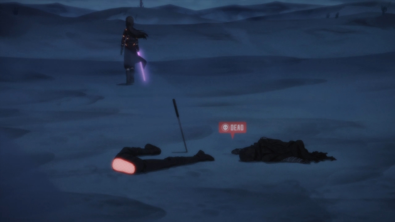 — Death Gun’s body is cut in half, but he is still “alive” enough to say a few final words to Kirito. How come you don’t see this when other people die? Why does Death Gun actually get to lie there on the ground and keep yapping? Because once again, SAO has never been about being true to MMOs.