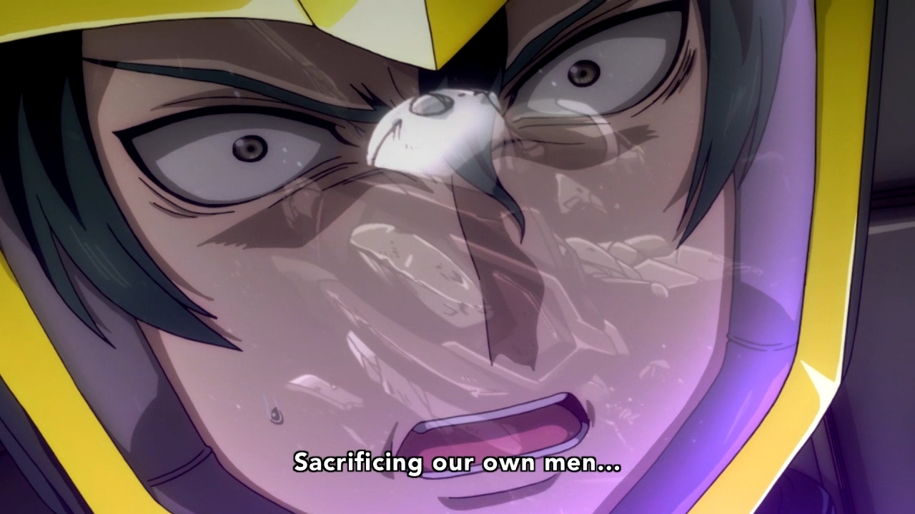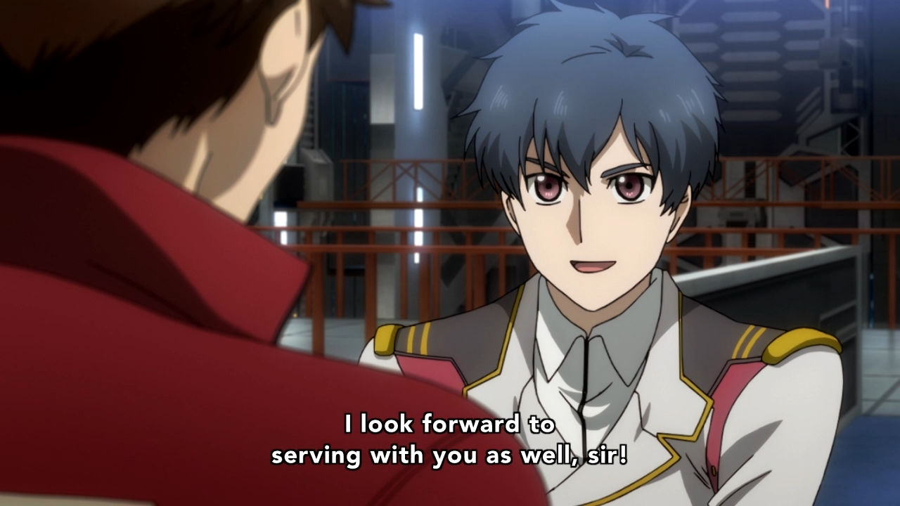 — It also feels a bit strange to introduce a new character at this stage of the game, but here’s Ensign Watase. He’s just one of the extra pilots for this mission, but the story feels the need to highlight his existence, so he must be important somehow… Still, the first episode is already half over, and I assume the second episode will be the same length. So there isn’t really much time left to do anything, much less squeeze in a new face. Maybe the only purpose to his character is to remind us that Aoba’s good at piloting mechas.