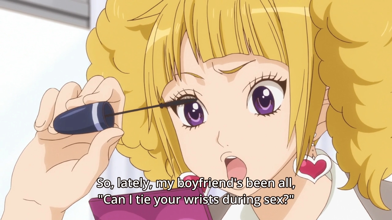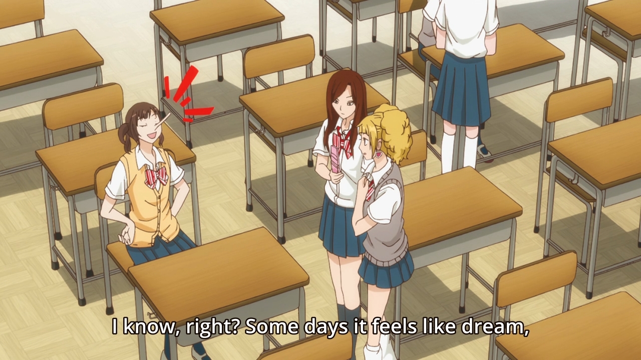 Anyway, the first episode kicks off with the first day of a new school year. Erika seems rather desperate to make friends, but maybe that’s just me. She’s the sort that talks a big game, but can’t back any of it up. Her one true friend even warns her that her boasts will bite her in the ass one day, which is just some not-so-subtle foreshadowing from the story. So when a pair of classmates talk about their boyfriends, our heroine can’t help but pretend as though she’s an expert on boys, relationships, and love in general. What’s perplexing is the logic behind her actions. She feels as though she has to put on airs or her newfound “friends” will kick her out of their group. But she hardly knows them. She has no clue whether or not her two classmates are even worth befriending. And if you get kicked just because you don’t have a boyfriend, what does that say about those classmates of yours?