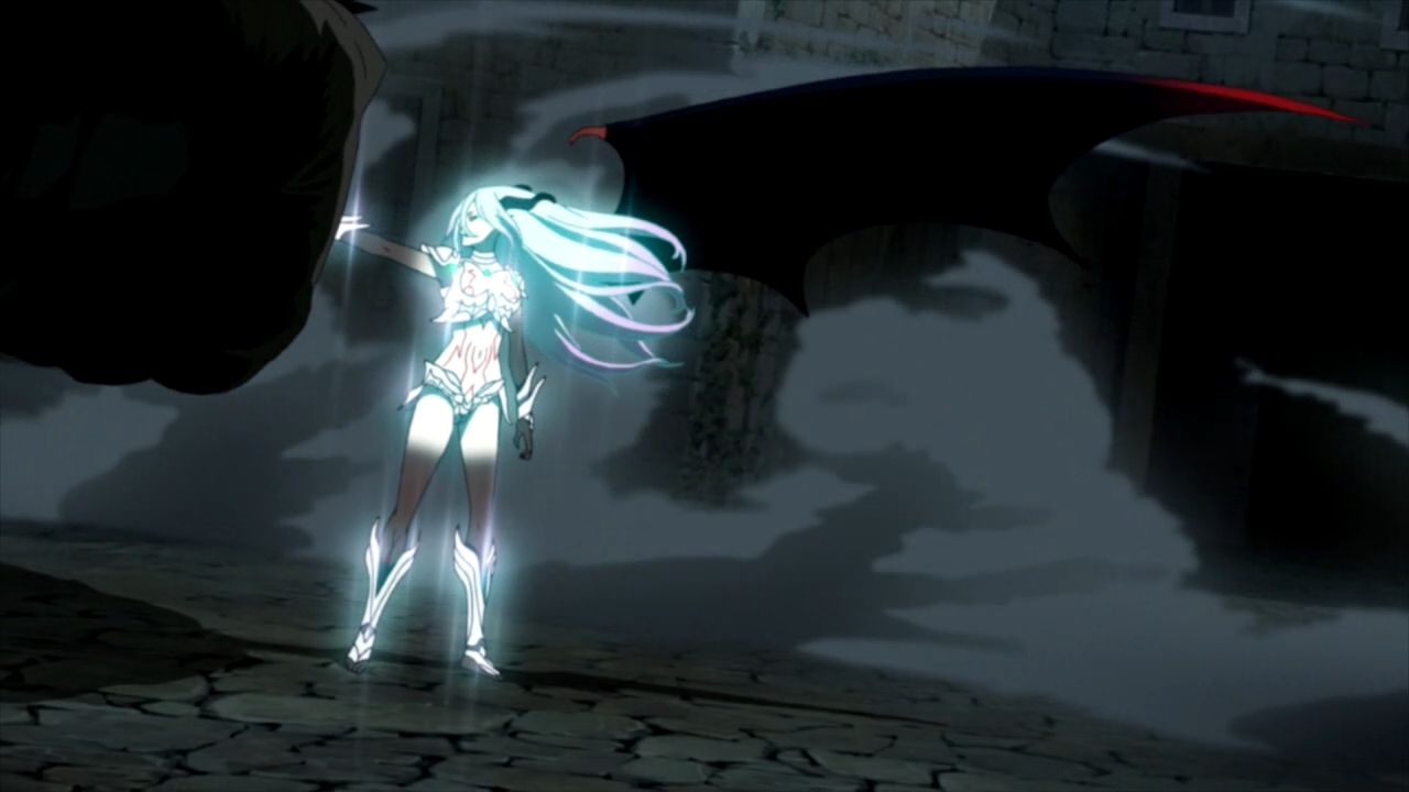Shingeki no Bahamut: Genesis is supposedly based on a card game in Japan, but it has the good taste to avoid, well, showing us the existence of any actual cards. So far, this is the closest thing to a card in this anime, and that’s just what bounties turn into when you capture them. Sure, there are still some unnatural card-like idiosyncrasies. For instance, people seem to be able to summon monsters, warriors, and whatnot to do their bidding. But the narrative doesn’t get bogged down by the need to explain the rules of the game. I mean, if you’ve seen other like-minded shows, you know what I’m talking about. Characters would prattle on and on about how to play some dumb game that the show is not-so-subtly trying to push down our throat. Again, this is not what we get here. We just jump right into the action, and there’s a whole lot of action. I don’t expect every episode to have this much action, of course, but this is the kind of opening episode that I want. There’s just enough information to leave me curious for more.