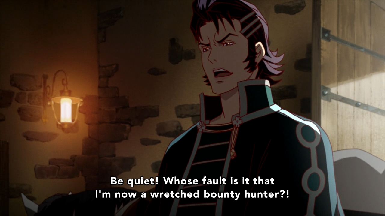 When a bounty shows up to get his revenge on Favaro — just earlier in the episode, our protagonist had captured the bad guy’s brother — the mysterious girl decides to take action. After all, she thinks Favaro can get her to Helheim, so she’s going to protect him for the time being. Favaro quickly realizes, however, that she is, well, a demon and a powerful demon at that. And as he passes out — in the fracas, a barrel lands on his head — he gets the kiss that he had bargained for, but not necessarily the kiss that he wanted. Y’see, he wakes up the next day to find that, well, he’s now got himself a demon tail. Has that magical kiss turned him into one of the mysterious girl’s kind as well? These two are not the primary characters in the story. Every rogue needs his straight man, too. A straight man does his job by setting up the punchline for the rogue to deliver, and that appears to be Kaisar’s job. So far, all we know about Kaisar is that he’s a disgraced former prince who must now become a bounty hunter as well. It’s almost certain that he too will be dragged into the mysterious girl’s quest.