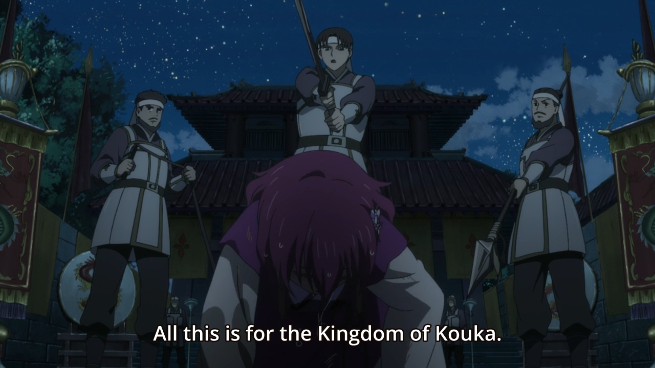 — And now, it seems as though she’s about to be executed by those insurgents the king had previously mentioned. That hooded figure chasing her earlier in the episode was probably one of these insurgents too. In any case, Yona cries for Soo-won, but only Hak comes to save her. The episode comes to a close, but I assume he and Yona will soon escape from the castle.