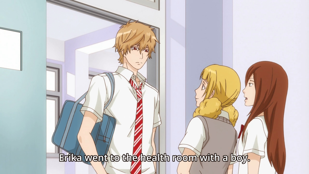 In last week’s episode, those two girls were actually talking shit behind Erika’s back. They initially suspected that our heroine didn’t have a boyfriend, and of course, they were right. They just don’t know they’re right, because Erika had managed to convince Kyouya to play along. Still, Erika allows herself to become Kyouya’s slave just to keep these “friends” around. Again, these are the same friends that had tried to expose her. So like I’ve said, they must be props for her, too. She keeps them around so she doesn’t look pathetic and lonely in high school. Otherwise, her shining high school life would fall apart or something. And isn’t that just a sad way to live? Doesn’t it feel hollow when your boyfriend is really just a prop that you use to make yourself look good? Furthermore, you’re only making yourself look good so you can keep these two “friends” around. Finally, you only keep these two friends around because they also make you look good! Like I’ve said, this all seems terribly hollow, doesn’t it?