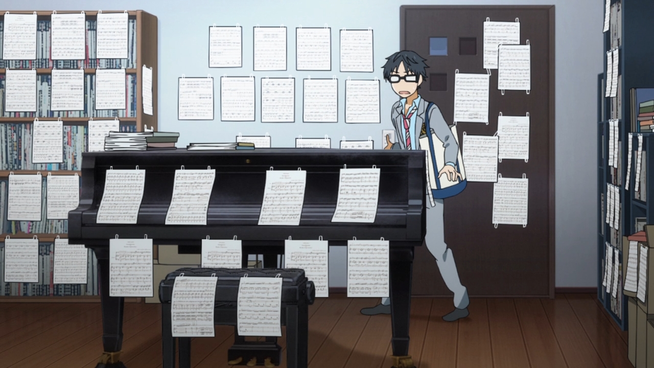 — So Kaori has gone and plastered the music room with sheet music. It’s like a scene from a horror movie. You walk into a room and you see blood all over the walls. You think I’m joking, but I’m not. Kousei’s mother literally drew blood when she beat him for not playing the piano well enough. And now, he sees sheet music all over the walls. It’s a fucking nightmare, yo. And here are the monsters. This guy is actually being forced to relive his nightmare. And it’s all played off as a joke.