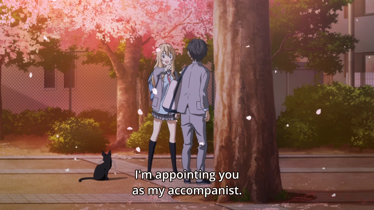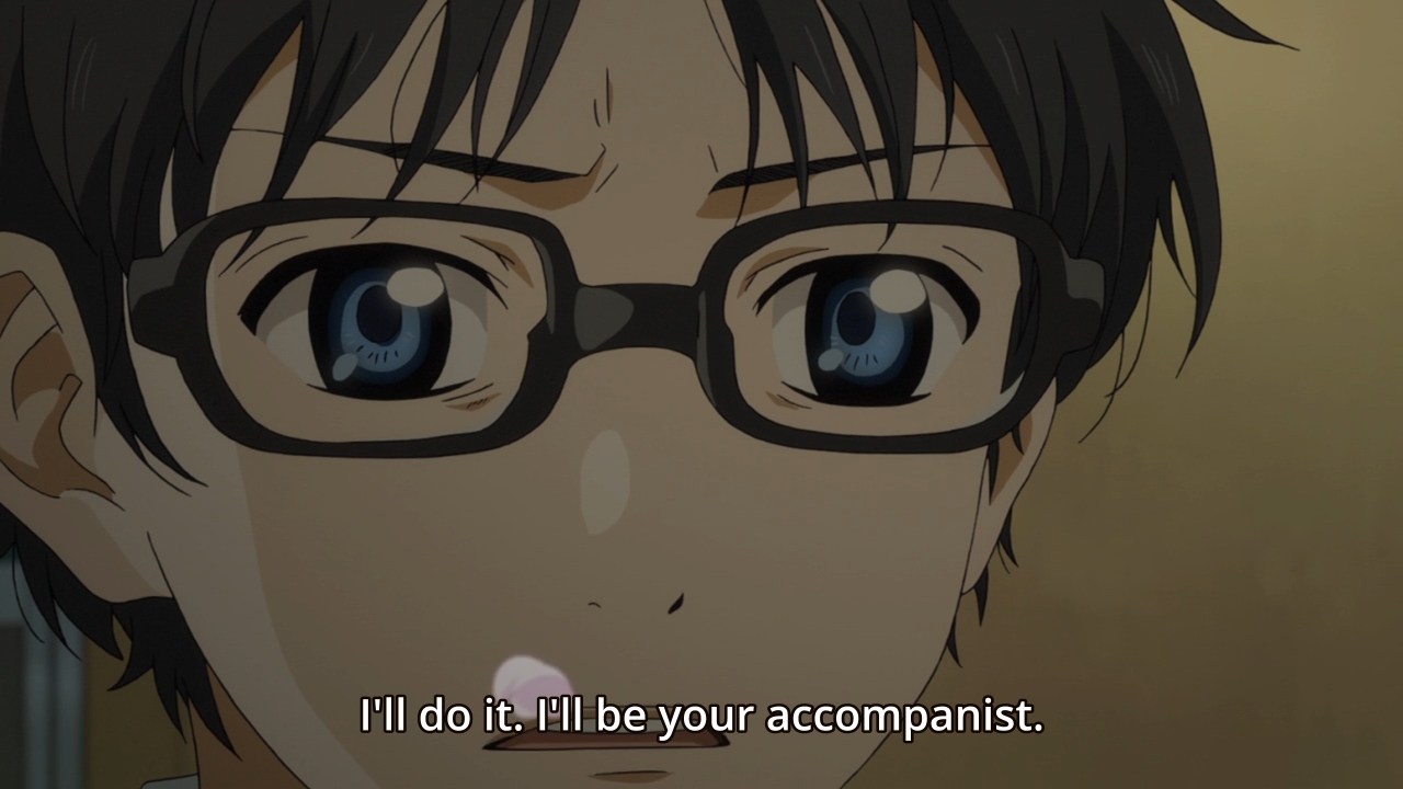 Honestly, honestly? At the end, I just wanted Kaori to say what’s really going on here: “Be my accompanist. It doesn’t matter if you can’t play or you suck or you break down halfway through, because this is literally all about me and what I want.”