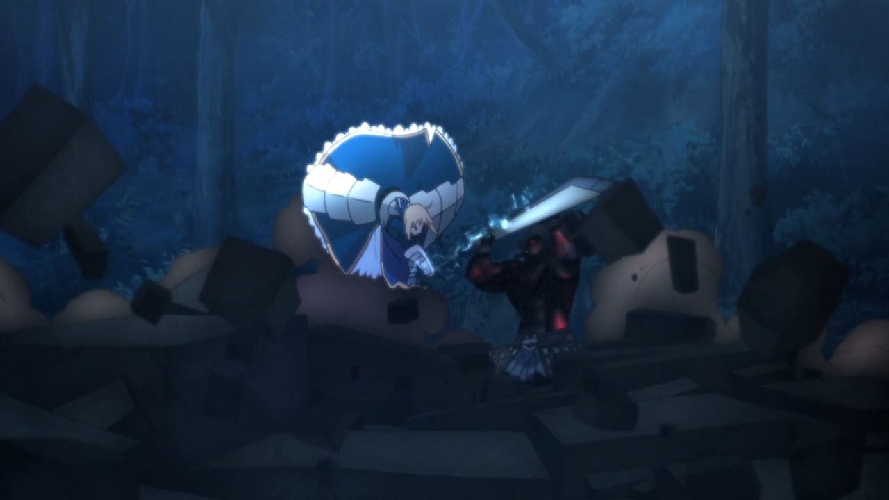 — Saber lands what appears to be a decisive blow, but upon death, Berserker can somehow reverse the flow of time and therefore come back to life. Archer thus uses this small window of opportunity to score a big blow. The result is an almost nuclear-like explosion. I wonder if anyone’s going to mention this on the news the next day. Or, y’know, notice how there’s a giant crater where a cemetery should be…